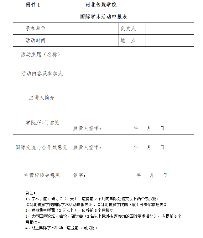 2. 河北传媒学院国际学术活动申报表(见附件2)。