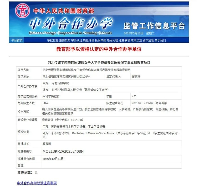 近日,河北传媒学院与韩国诚信女子大学合作举办音乐表演专业本科教育项目成功获批(批准书编号:MOE13KR2A20252408N),这是学校首次获批的中外合作办学项目。