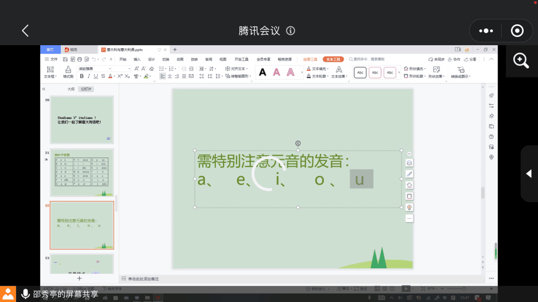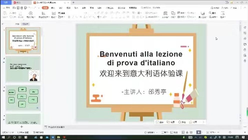 3月12日下午,河北传媒学院意大利语免费体验课活动以线上的方式正式开始。意大利语锡耶纳(CILS)考试主考官、佩鲁贾(CELI)考试主考官邵秀亭老师为我校近两百名意大利语零基础的师生讲授了第一节课,简要介绍了意大利地理及文化概况,重点讲解了意大利语的基础发音规则、字母发音以及发音特点,并与学生互动,指导学生开口练习简单实用的意大利日常用语。课堂内容丰富、气氛活跃,学生学习兴趣浓厚。