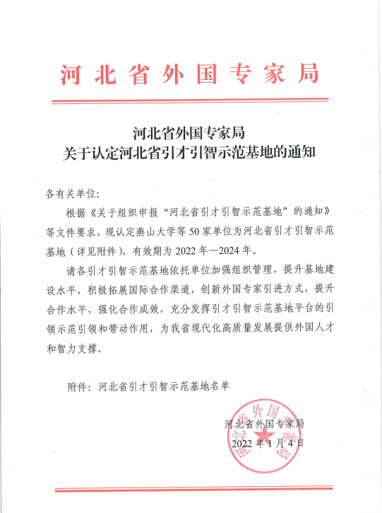 根据河北省科技厅下发的《河北省外国专家局关于认定河北省引才引智示范基地的通知》,我校获批“河北省引才引智示范基地”,这是我校在海外引才引智工作上取得的一项标志性成果,为我校今后引进外国专家、拓展国际合作渠道、提升教育对外开放水平奠定了基础。