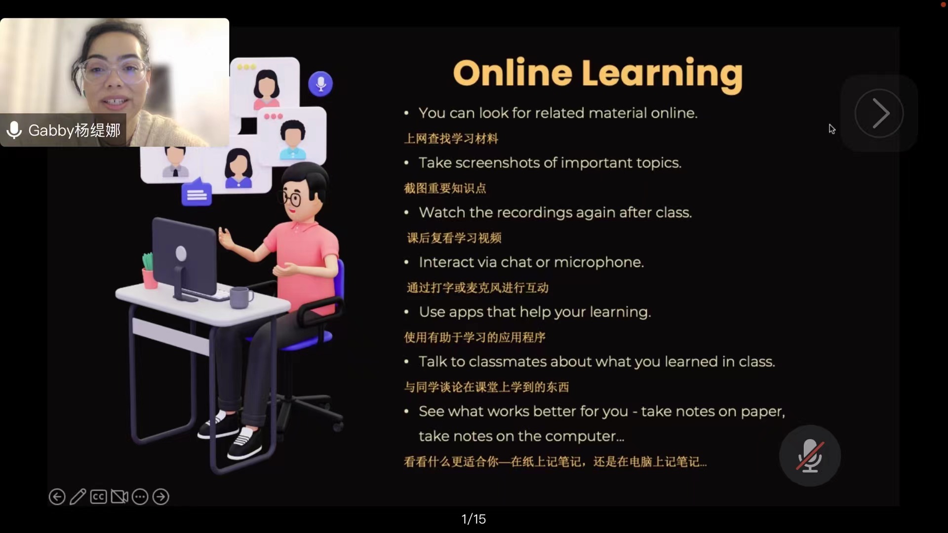 外教Gabriela 围绕“疫情期间如何合理安排大学生活”的主题,从培养兴趣爱好、开拓新技能、远程学习技巧、平衡学习生活及职业规划等角度给出建议和指导,告诫同学们疫情期间在保证身心健康的前提下,珍惜当下大学时光,合理规划,重点关注个人成长及自我提升。