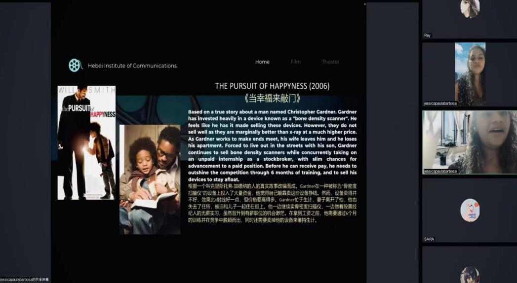 11月18日, 河北传媒学院第二十一期英语沙龙线上举办,我校外籍教师杰西卡·巴博萨(Jessica Barbosa)担任此次主讲人,为同学们开展了题为“浅谈建设性观影视角”的专题讲座。