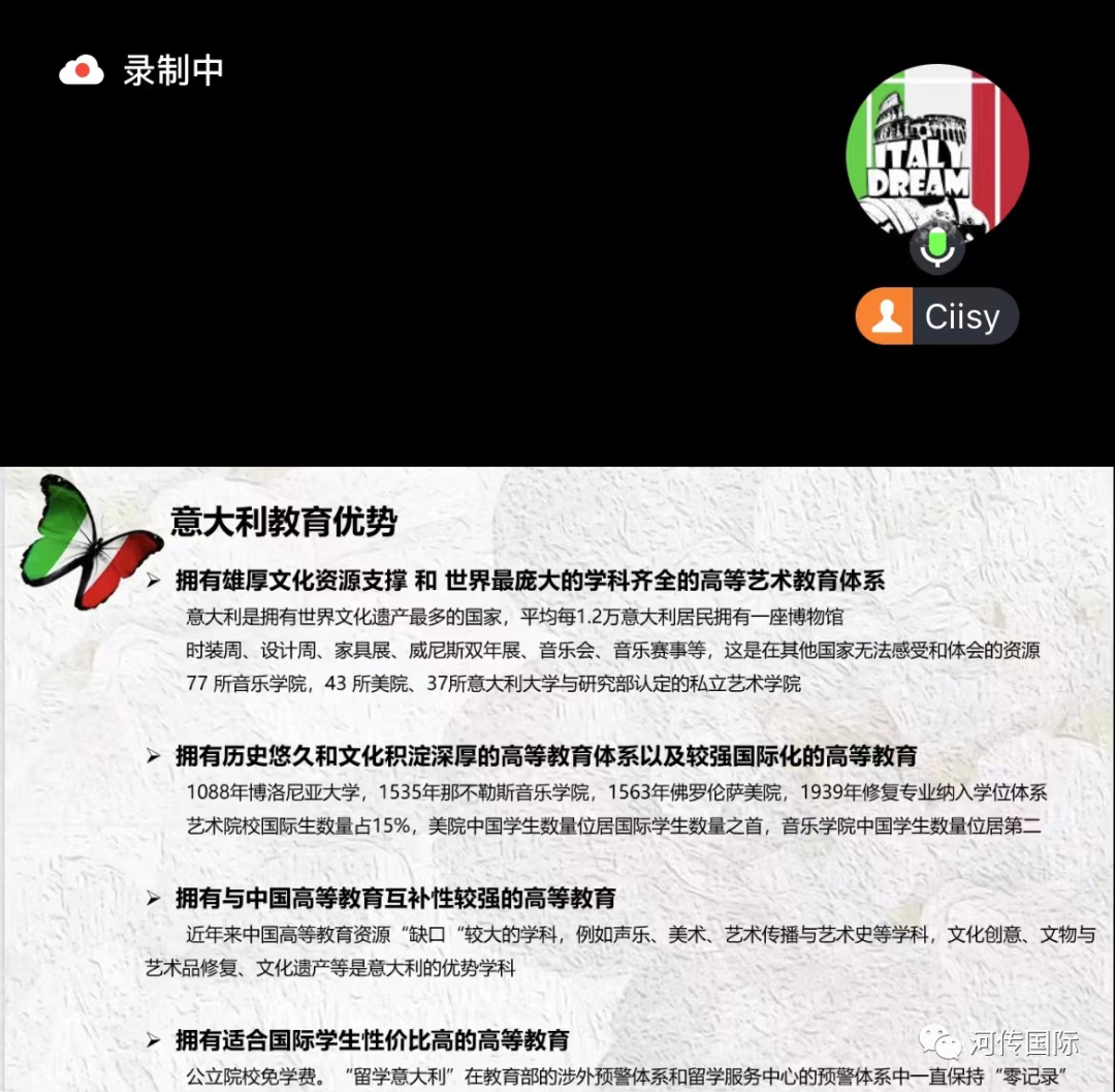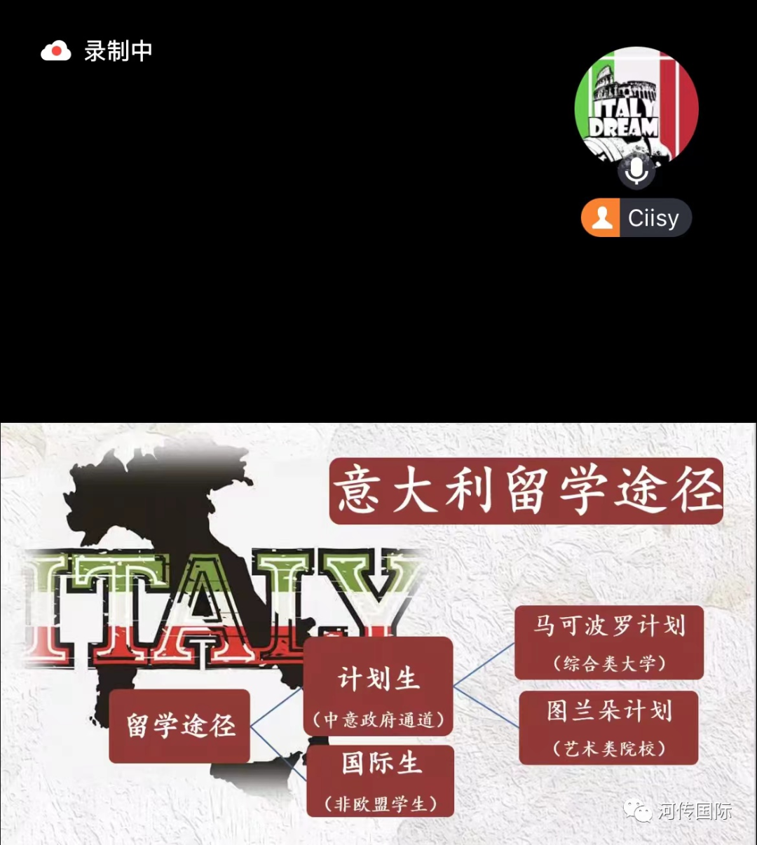 项目负责人李婧老师为学生们介绍了意大利的概况、教育环境、校际交流项目及交换生项目,并详细介绍了那不勒斯美院本升硕及佛罗西诺内美院本科交换生报名申请流程及准备工作等。