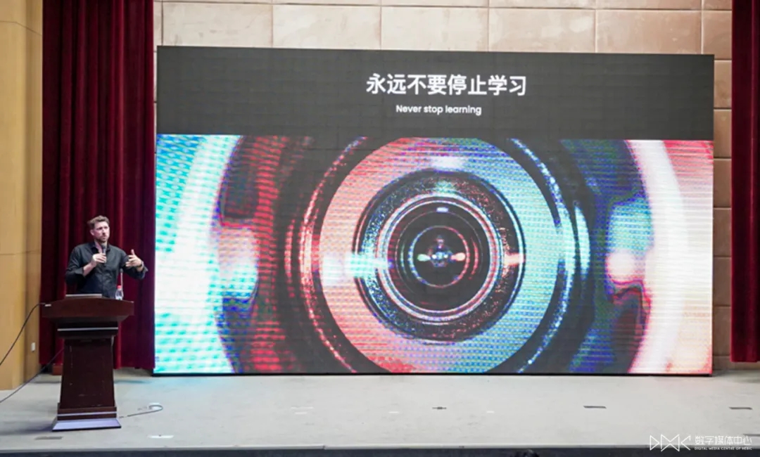 Darren老师讲到在当今环境下,即使没有大量资金,也可以实现拍摄长片电影的想法。首先要组建自己的团队;其次要勇于试错,多去跟组拍摄积累自己的经验;除此以外,还可以通过加入有关影视的一些社团或组织来积累自己的人脉资源。Darren老师呼吁同学们永远不要停下学习的脚步,从学校毕业后只是一个新的开始,只有通过大量实践才会让自己成为一个更专业的人。讲座的互动环节,Darren老师通过问答一起探讨了有关创作与人工智能的相关问题。