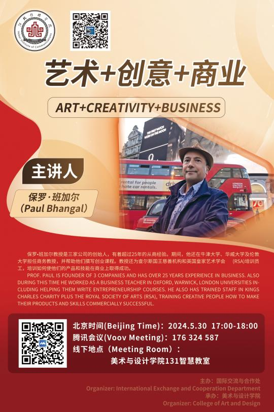 2024年5月30日,英国伦敦保罗·班加尔教授受邀为美术与设计学院师生带来了一场题为“艺术+创意+商业”的学术报告。活动由国际交流与合作处处长崔娜主持,美术与设计学院院长助理赵昆、教研室主任赵新伟等专业教师出席了本次活动。2022级视觉传达设计专业近两百名学生到场聆听了本次讲座。
