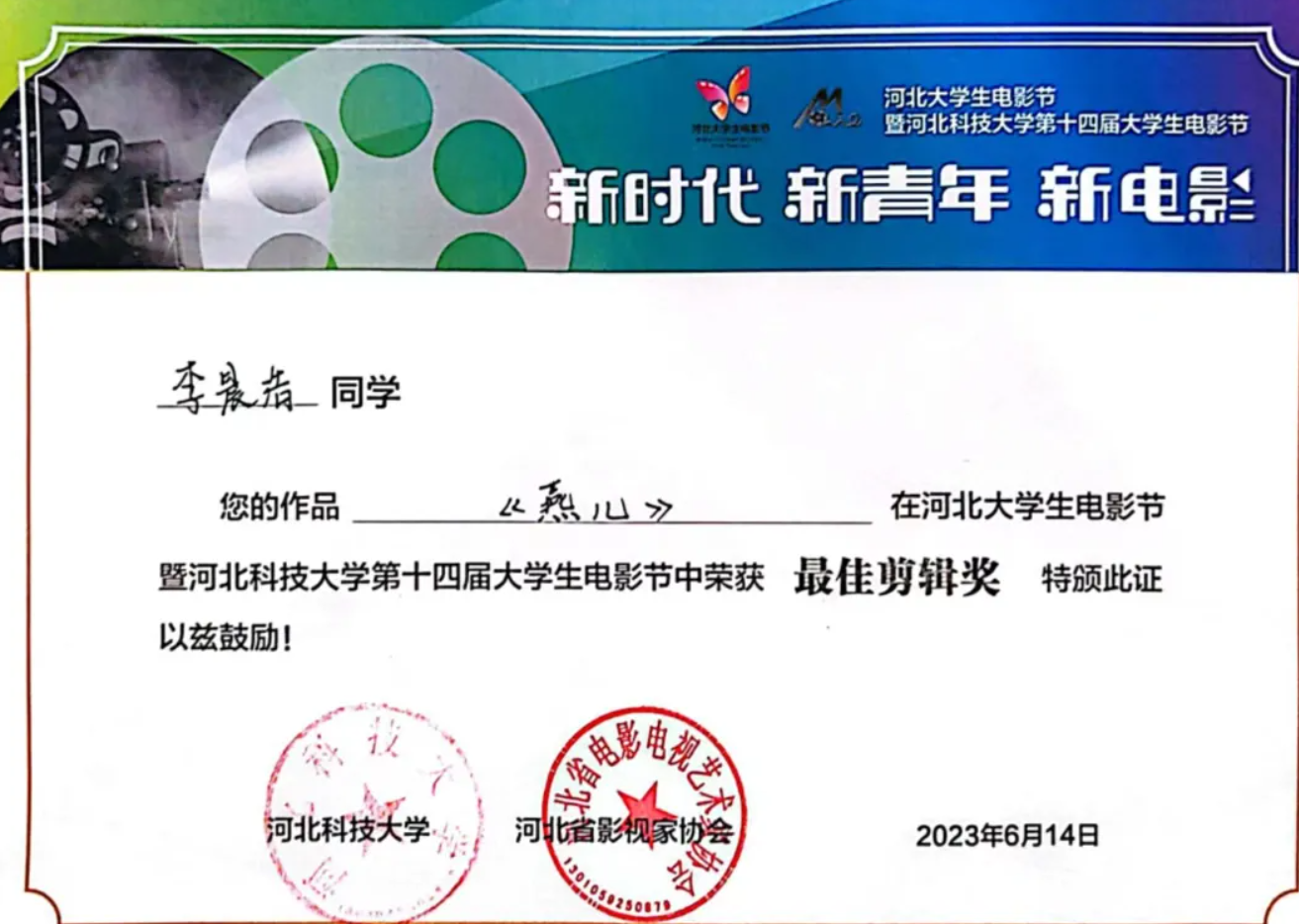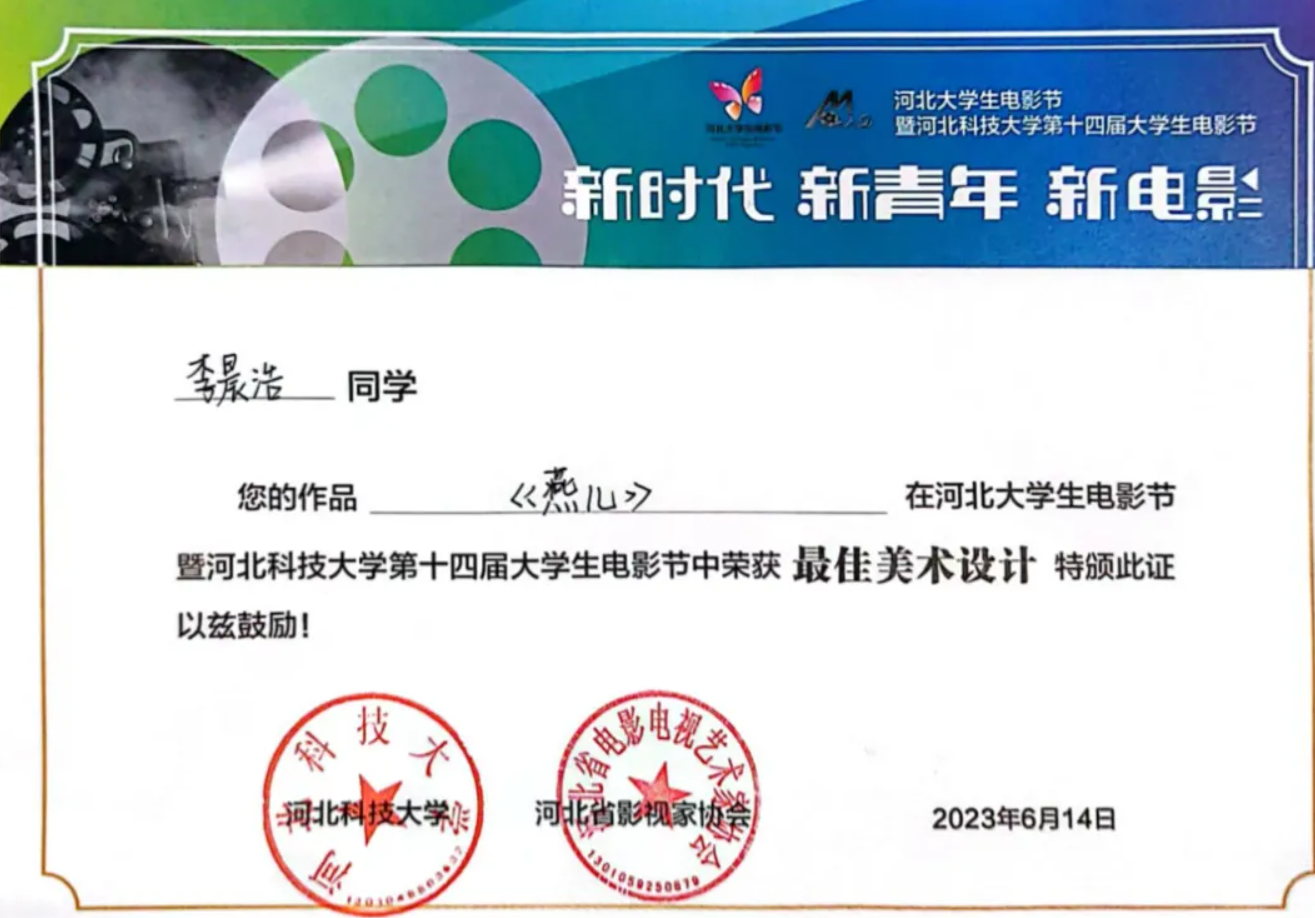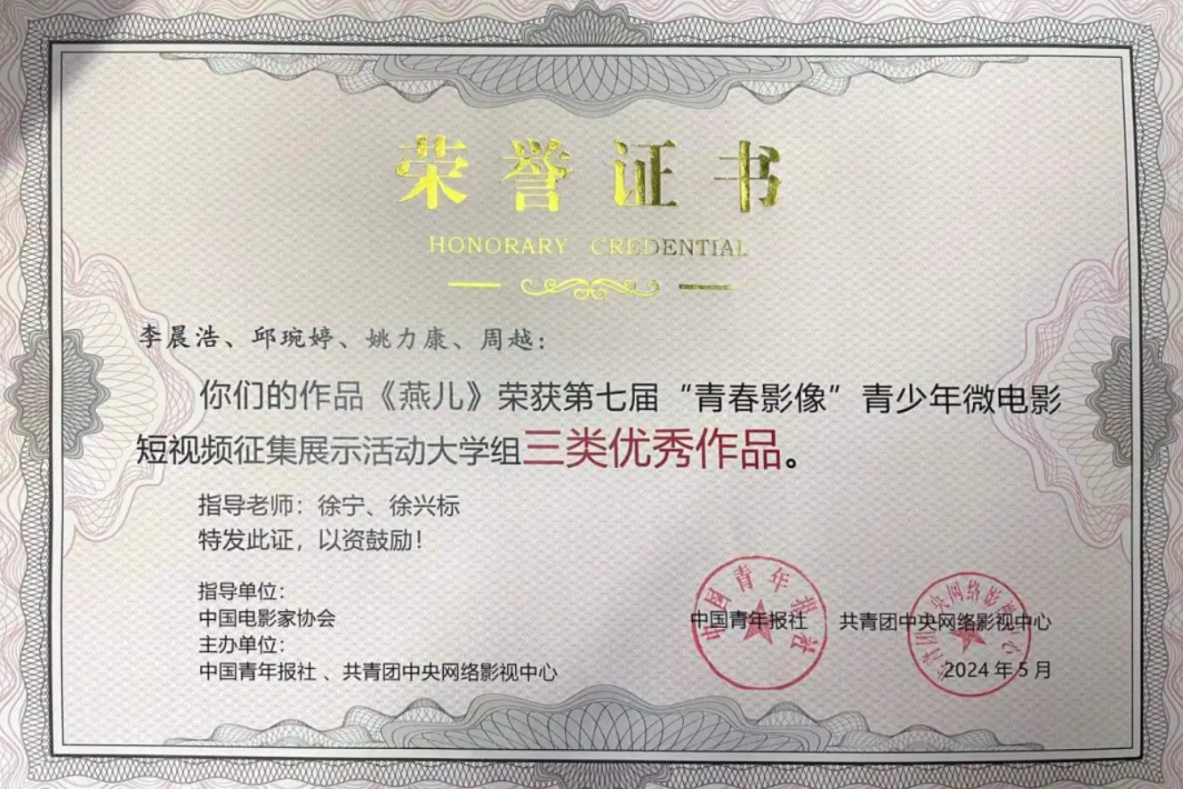 近日,我校影视艺术学院2019级影视摄影与制作专业学生李晨浩导演的剧情片《燕儿》在第19届美国红花石国际电影节(中国单元)荣获“最佳原创剧本”奖。