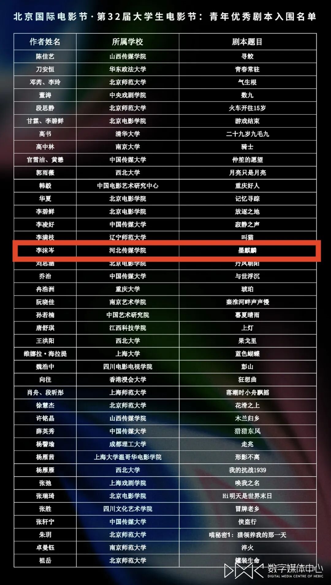 2025年4月9日,北京国际电影节·第32届大学生电影节公布了第十一届青年优秀剧本推选入选结果。我校影视艺术学院广播电视编导专业2024届毕业生李沫岑凭借原创剧本《墨麒麟》成功入围。该剧本是影视艺术学院方姝老师指导的2024届本科毕业设计,本次成功入围,不仅是对我校影视艺术教育成果的充分肯定,更为学校赢得了荣誉!