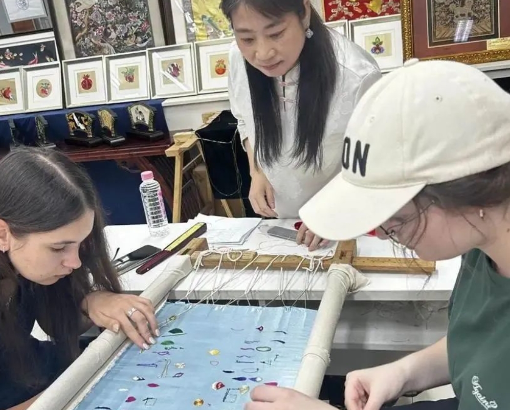 为让俄罗斯学生沉浸式体验中华优秀传统文化,美术与设计学院精心安排了非遗京绣文化体验课。在京绣工作室隗和蕊老师的指导下,学生们亲手尝试被誉为“燕京八绝”之一的京绣技艺,在一针一线间感受指尖艺术的精妙与匠心传承。活动现场气氛热烈,不少俄罗斯学生还兴致盎然地试穿了由学院学生亲手刺绣的旗袍,留下难忘的文化互动瞬间。
