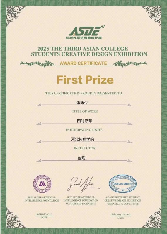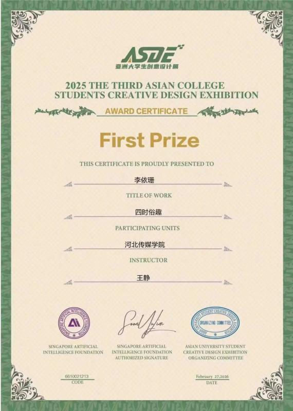近日,第三届亚洲大学生创意设计展结果公布,河北传媒学院美术与设计学院视觉传达设计专业学生表现突出,在586所海内外高校、 7844余件参赛作品中脱颖而出,共斩获一等奖3项、二等奖5项、三等奖8项、优秀奖9项、优秀指导教师奖4项。