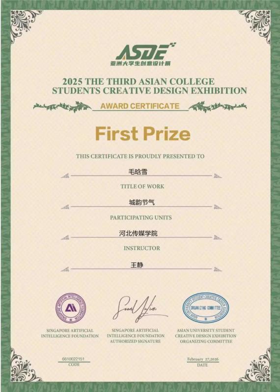 我校始终坚持以赛促教、以赛促学的人才培养理念,积极搭建实践育人平台,鼓励学生参与高水平学科竞赛,不断强化创新思维与实践能力培养。此次获奖是我校视觉传达设计专业教学成果的又一次集中体现,学校将继续深化实践教学与创新能力培养,持续推动专业建设与人才培养质量再上新台阶。